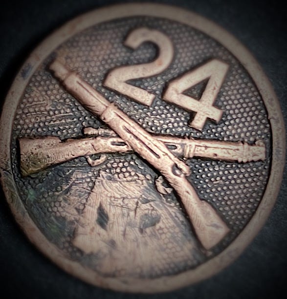 While others slept, I’d pull out his insignia pin from my pocket. A round “collar disc” with the number “24” in the center, and two crossed rifles beneath. I’d already developed a nervous habit of holding it between my thumb and forefinger and rubbing it.