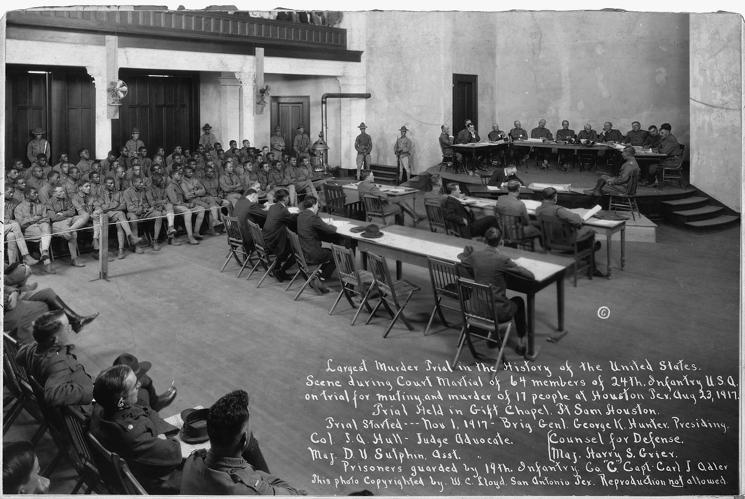 We pulled into Fort Sam Houston and reported to the adjutant for Major Ely at El Paso District Headquarters. He briefed us as to how the Negro Twenty-Fourth Brigade, assigned to guard construction projects at Camp Logan, had mutinied in Houston some months prior. Local citizens were killed, including several white men and police officers. In the largest trial in U.S. history, thirteen of the sixty-four indicted Negro Brigade soldiers were sentenced to hang.