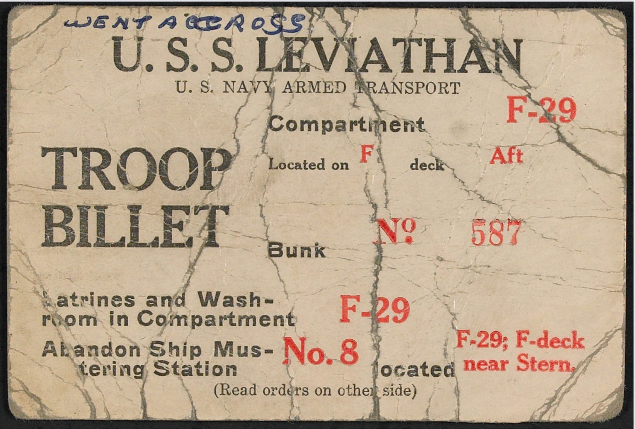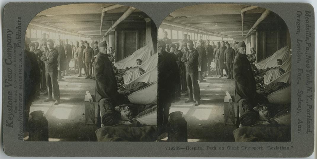 Leviathan was a German-built luxury ship called Vaterland before the U.S government seized and refitted her. She spanned a thousand feet long and looked unworldly with her "grey and dazzle white" camouflage. Carrying fifty pounds of gear, a soldier might nearly fall over backwards staring up at her smokestacks while waiting on her steep gangplank.