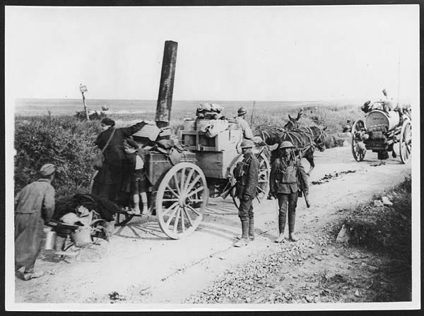 As we marched into the countryside, we began passing hordes of refugees, including countless French peasants fleeing the German Spring Offensive. So many rickety old wagons struggled by us tightly crowded with women and kids sitting on large cloth bags stuffed with belongings and beat-up furniture. What struck me was how few horses there were. All these worn-out old grandpas were tugging carts and wagons holding people or pushing wheelbarrows stacked high with clothes, a few wilted vegetables, and household items. Worn-out grandmas too. It was quite a time before I realized there were hardly any young men left, and most of the horses had been requisitioned, looted, or eaten.